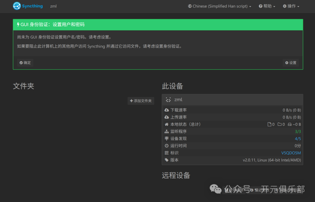 首次进入会有红色警告,点击设置,为 GUI 设置一个账号密码。