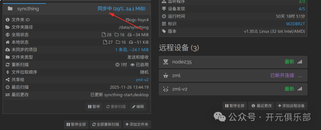 ~/.config/syncthing/logs 或 Web 界面“操作” > “日志”)。