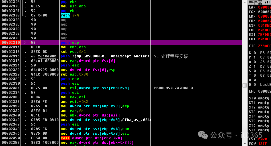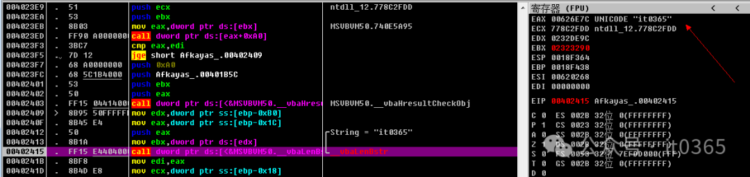 00402409   > \8B95 50FFFFFF mov edx,dword ptr ss:[ebp-0xB0]0040240F   .  8B45 E4       mov eax,dword ptr ss:[ebp-0x1C]00402412   .  50            push eax                                 ; /String = "it0365"00402413   .  8B1A          mov ebx,dword ptr ds:[edx]               ; |00402415   .  FF15 E4404000 call dword ptr ds:[<&MSVBVM50.__vbaLenBs>; \__vbaLenBstr