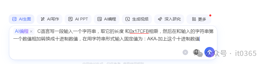 打开百度AI后,选择AI编程,直接输入:C语言写一段输入一个字符串,取它的长度 和0x17CFB 相乘,然后在和输入的字符串第一个数值相加转换成十进制数值,在用字符串形式输入固定值为:AKA-加上这个十进制数值