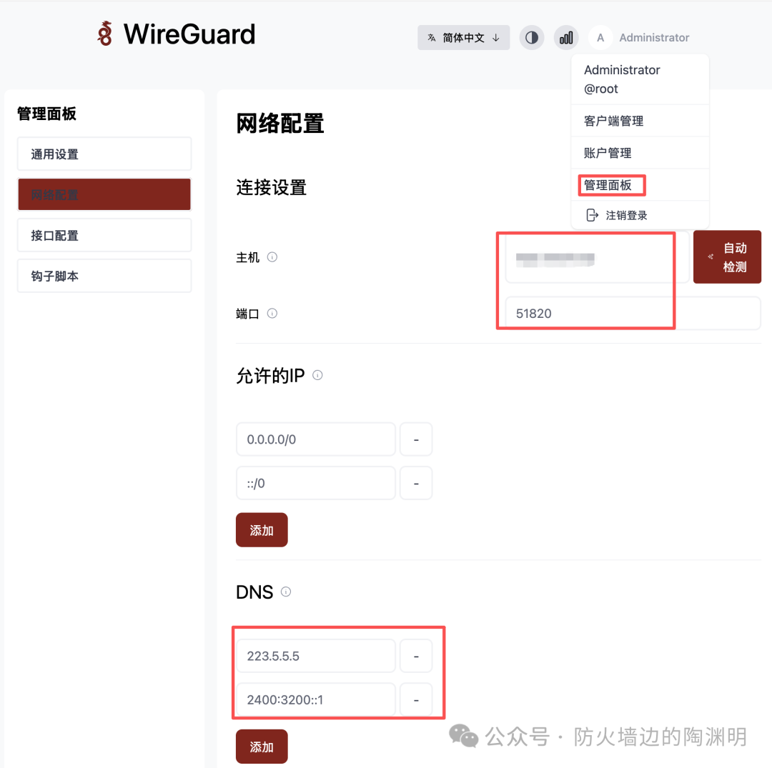 修改管理面板中相关信息,主机这里最好用公网 IPv6 对应的域名并修改为阿里云的 DNS 地址,参考告别内网穿透!家庭宽带动态公网 IP + DDNS,安全访问家中设备!家庭网络升级秘籍:如何通过 IPv6 访问家里的设备?