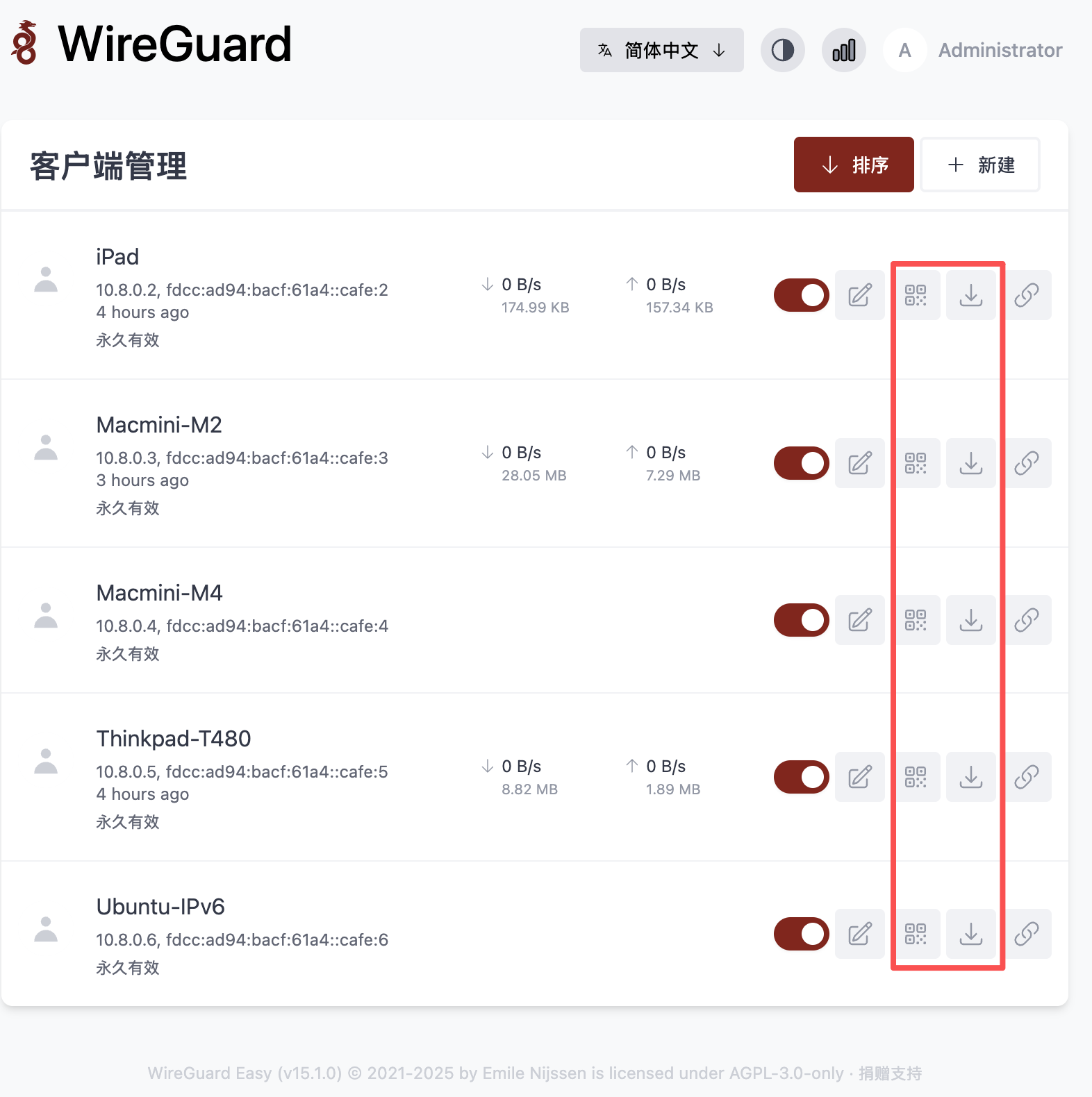 客户端管理页面提供二维码和配置文件下载,方便客户端软件导入。官网下载地址: