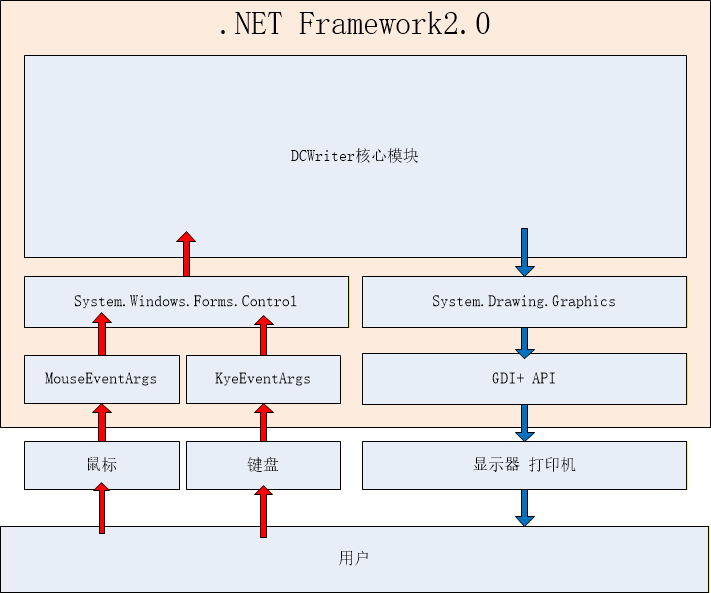 在这个架构图中,System.Windows.Forms.Control和System.Drawings.Graphics是最核心的类型。System.Windows.Forms.Control类型用于将鼠标键盘事件发送给DCWriter核心模块来完成用户互动的操作。而DCWriter核心模块则使用System.Drawings.Graphics类型来绘制用户界面,使得软件和用户互动,形成一个闭环。