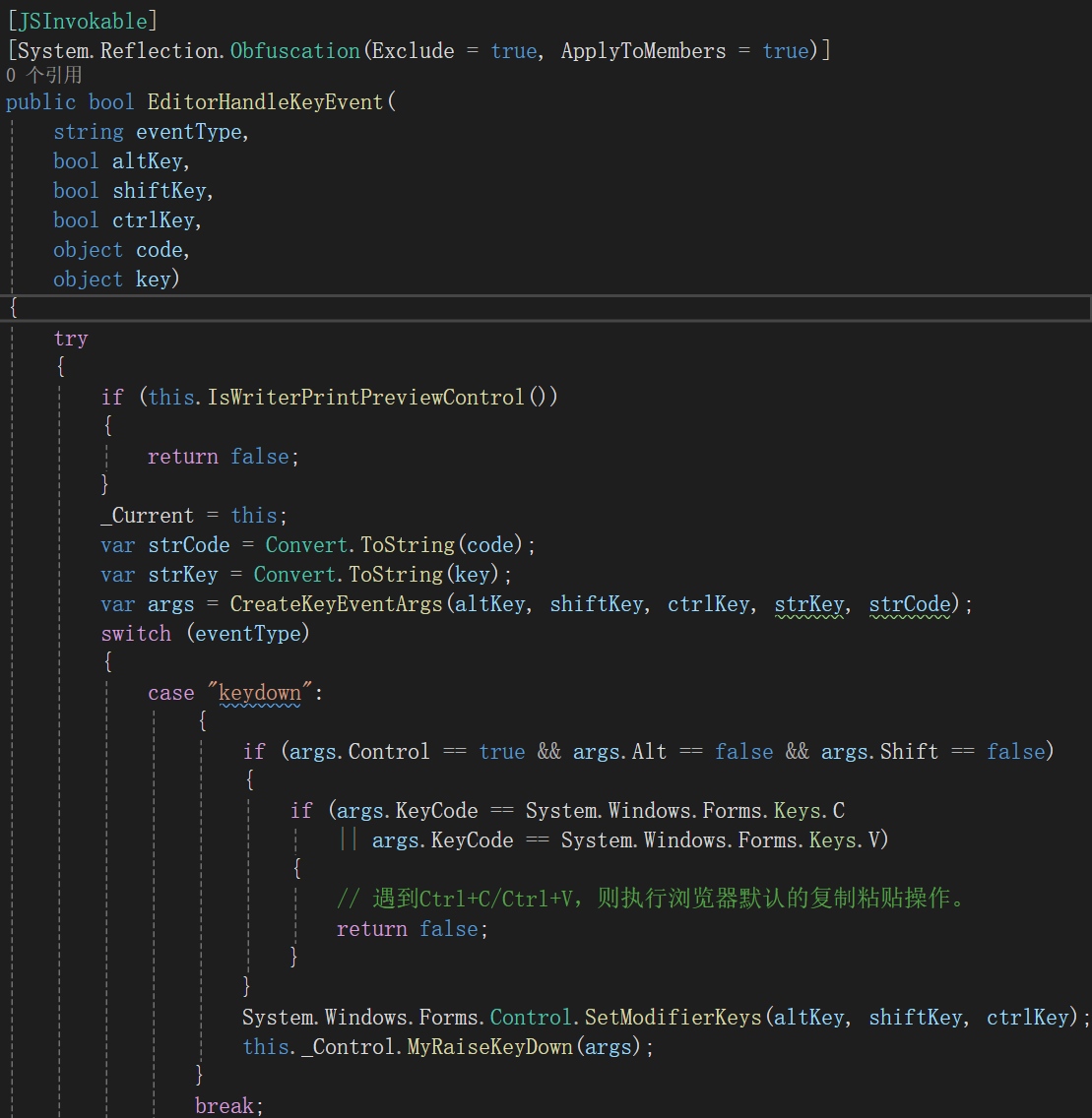 这是一个标记了[JSInvokeable]的函数,这个函数接受JS端传过来的事件参数,将其转换为一个System.Windows.Forms.KeyEventArgs,然后根据事件名称触发控件的键盘事件。