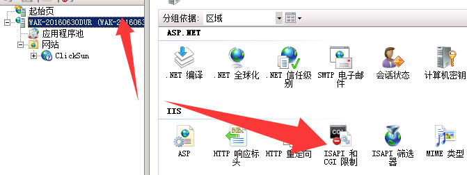 1、进入IIS,点击最上级服务器(注意不是网站,是服务器),右侧找到ISAPI和CGI限制: