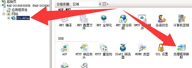 2、左侧点击网站,右侧进入“处理程序映射”: