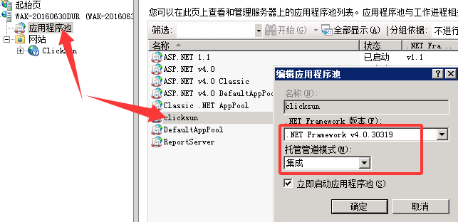 3、检查网站应用程序池是否4.0和集成模式,不是就去应用程序池里改