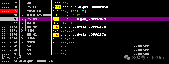 00442C33  |. /75 17         jnz short aLoNg3x_.00442C4C00442C35  |. |8B45 FC       mov eax,[local.1]00442C38  |. |8B55 F4       mov edx,[local.3]00442C3B  |. |E8 040FFCFF   call aLoNg3x_.00403B4400442C40  |. |75 04         jnz short aLoNg3x_.00442C4600442C42  |. |B3 01         mov bl,0x100442C44  |. |EB 06         jmp short aLoNg3x_.00442C4C