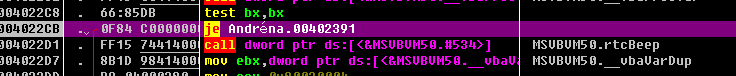 00402132   > /85C0          test eax,eax00402134   . |0F84 9C000000 je Andréna.004021D60040213A   . |8D55 94       lea edx,dword ptr ss:[ebp-0x6C]0040213D   . |8D45 DC       lea eax,dword ptr ss:[ebp-0x24]00402140   . |52            push edx00402141   . |50            push eax00402142   . |C745 901000>mov dword ptr ss:[ebp-0x64],0x100402149   . |89594       mov dword ptr ss:[ebp-0x6C],ebx          ;  MSVBVM50.__vbaVarDup0040214C   . |FF15 90414000 call dword ptr ds:[<&MSVBVM50.__vbaI4Var>;  MSVBVM50.__vbaI4Var00402152   . |8D4D BC       lea ecx,dword ptr ss:[ebp-0x44]          ; |00402155   . |50            push eax                                 ; |Start = 0x18F3AC00402156   . |8D55 84       lea edx,dword ptr ss:[ebp-0x7C]          ; |00402159   . |51            push ecx                                 ; |dString8 = 0018F3BC0040215A   . |52            push edx                                 ; |RetBUFFER = 0018F3CC0040215B   . |FF15 38414000 call dword ptr ds:[<&MSVBVM50.#632>]     ; \rtcMidCharVar00402161   . |8D45 84       lea eax,dword ptr ss:[ebp-0x7C]00402164   . |8D4D A8       lea ecx,dword ptr ss:[ebp-0x58]00402167   . |50            push eax                                 ; /String8 = 0018F3AC00402168   . |51            push ecx                                 ; |ARG2 = 0018F3BC00402169   . |FF15 70414000 call dword ptr ds:[<&MSVBVM50.__vbaStrVa>; \__vbaStrVarVal0040216F   . |50            push eax                                 ; /String = ""00402170   . |FF15 0C414000 call dword ptr ds:[<&MSVBVM50.#516>]     ; \rtcAnsiValueBstr00402176   . |66:8985 4CFFF>mov word ptr ss:[ebp-0xB4],ax0040217D   . |8D55 CC       lea edx,dword ptr ss:[ebp-0x34]00402180   . |8D85 44FFFFFF lea eax,dword ptr ss:[ebp-0xBC]00402186   . |52            push edx                                 ; /var18 = 0018F3CC00402187   . |8D8D 74FFFFFF lea ecx,dword ptr ss:[ebp-0x8C]          ; |0040218D   . |50            push eax                                 ; |var28 = 0018F3AC0040218E   . |51            push ecx                                 ; |saveto8 = 0018F3BC0040218F   . |89944FFFFFF mov dword ptr ss:[ebp-0xBC],ebx          ; |MSVBVM50.__vbaVarDup00402195   . |FF15 94414000 call dword ptr ds:[<&MSVBVM50.__vbaVarAd>; \__vbaVarAdd0040219B   . |8BD0          mov edx,eax0040219D   . |8D4D CC       lea ecx,dword ptr ss:[ebp-0x34]004021A0   . |FFD6          call esi                                 ;  MSVBVM50.__vbaVarMove004021A2   . |8D4D A8       lea ecx,dword ptr ss:[ebp-0x58]004021A5   . |FF15 B8414000 call dword ptr ds:[<&MSVBVM50.__vbaFreeS>;  MSVBVM50.__vbaFreeStr004021AB   . |8D55 84       lea edx,dword ptr ss:[ebp-0x7C]004021AE   . |8D45 94       lea eax,dword ptr ss:[ebp-0x6C]004021B1   . |52            push edx004021B2   . |50            push eax004021B3   . |53            push ebx                                 ;  MSVBVM50.__vbaVarDup004021B4   . |FFD7          call edi                                 ;  MSVBVM50.__vbaFreeVarList004021B6   . |83C4 0C       add esp,0xC004021B9   . |8D8D E8FEFFFF lea ecx,dword ptr ss:[ebp-0x118]004021BF   . |8D95 F8FEFFFF lea edx,dword ptr ss:[ebp-0x108]004021C5   . |8D45 DC       lea eax,dword ptr ss:[ebp-0x24]004021C8   . |51            push ecx                                 ; /TMPend8 = 0018F3BC004021C9   . |52            push edx                                 ; |TMPstep8 = 0018F3CC004021CA   . |50            push eax                                 ; |Counter8 = 0018F3AC004021CB   . |FF15 AC414000 call dword ptr ds:[<&MSVBVM50.__vbaVarFo>; \__vbaVarForNext004021D1   .^\E9 5CFFFFFF   jmp Andréna.00402132