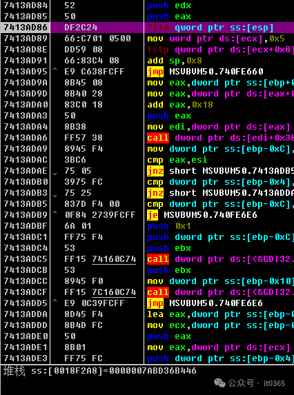 004021D6   > \8D4D CC       lea ecx,dword ptr ss:[ebp-0x34]004021D9   .  8D95 54FFFFFF lea edx,dword ptr ss:[ebp-0xAC]004021DF   .  51            push ecx                                 ; /var18 = 0018F404004021E0   .  8D45 94       lea eax,dword ptr ss:[ebp-0x6C]          ; |004021E3   .  52            push edx                                 ; |var28 = 0018F38C004021E4   .  50            push eax                                 ; |SaveTo8 = 0018F3CC004021E5   .  C785 5CFFFFFF>mov dword ptr ss:[ebp-0xA4],0x499602D2   ; |004021EF   .  C785 54FFFFFF>mov dword ptr ss:[ebp-0xAC],0x3          ; |004021F9   .  FF15 5C414000 call dword ptr ds:[<&MSVBVM50.__vbaVarMu>; \__vbaVarMul