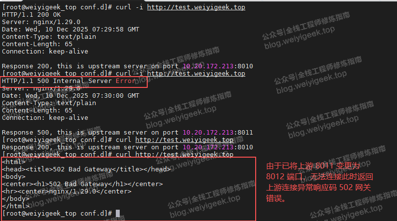 • 步骤 04.配置修改完毕后执行 nginx -t 命令验证配置是否正确,再执行 nginx -s reload 命令重载 nginx,同样使用 curl 命令模拟访问,用于测试上游服务在连接异常以及特定的上游响应码的相关指令处理效果。