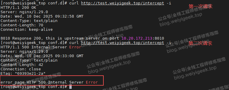 验证3.访问 /intercept 路径,验证拦截上游服务(backend_intercept)响应错误码,用以验证自定义错误页面,由图可知,等一次请求到上游 10.20.172.213:8010 中返回的 200,而第二次请求到上游 10.20.172.213:801 中返回的 500 状态码,遂返回自定义500 错误页面。
