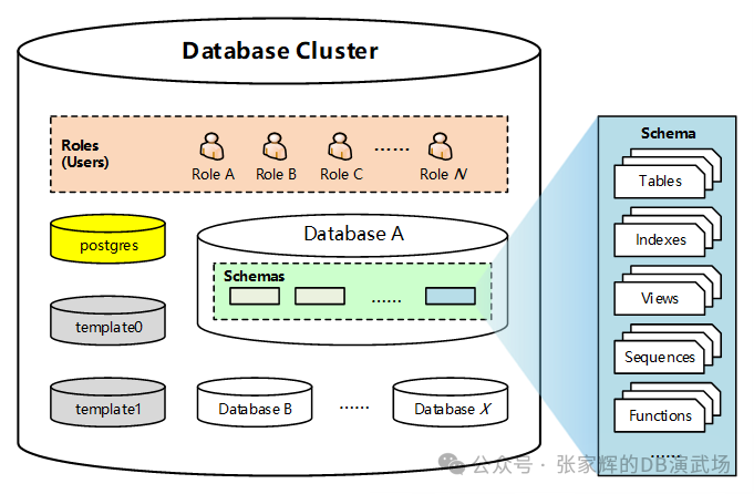 PostgreSQL的逻辑结构PostgreSQL的逻辑结构采用层级式设计,从高到低依次为:数据库集群→数据库(Database)→模式(Schema)→数据库对象(表/视图/函数等),其中多个数据库可以共享同一实例但它们之间相互隔离,模式作为命名空间管理对象,用户和角色全局统一管理权限。​​数据库(Database)...
