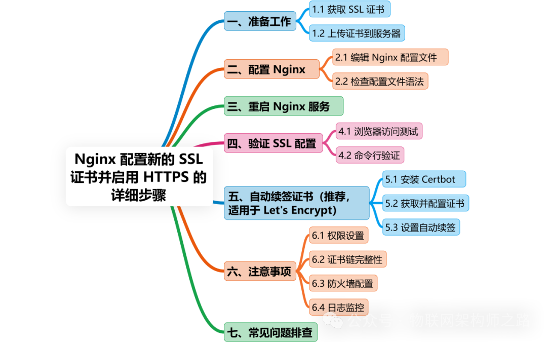 以下是在Nginx配置新SSL证书并启用HTTPS的详细步骤,适用于手动安装证书或结合LetsEncrypt自动管理的情况:1.准备工作1.1获取SSL证书•证书来源:○从证书颁发机构(CA)购买证书(如阿里云、腾讯云、DigiCert等)。○使用LetsEncrypt免费证书(推荐)。○生成自签名证书(仅用于测试环...