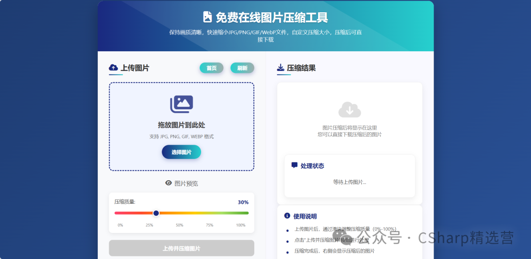 前几天填写备案资料时需要上传营业执照,要求2MB以内,老板发给我的文件有十几MB,无法上传,用网上的在线工具,又担心安全性。以前也经常遇到需要图片太大的问题,基本上都是找别人用vip办公软件处理的,每次都要麻烦别人,于是我就想着自己做一个,使用方便还安全。接下来我给大家介绍一下我的图片压缩工具,源码在结尾。使用说明上传...