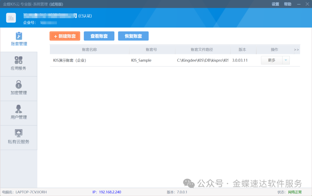 一、建账流程1、登录【金蝶KIS云专业版—系统管理】,点击+【新建账套】2.【系统信息】下填写以下信息:账套名称:建议使用公司简称(如:XX公司2025年账套);数据库路径:选择非系统盘(如D盘)存储账套数据;公司名称:填写全称(用于报表打印);完成后点击【下一步】3、【参数设置】下填写以下信息:公司纳税性质:根据公司...