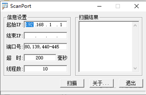 ScanPort是一款扫描IP端口的小工具。安装环境操作系统:Windows7及以上资源链接:https://pan.baidu.com/s/1RVWsJPRdPubjB9ppBTh4Bg提取码:xyj1安装步骤第一步、下载并安装解压压缩包即可。第二步、测试使用方法1、双击exe文件即可2、可以设置扫描开始的IP和结束...