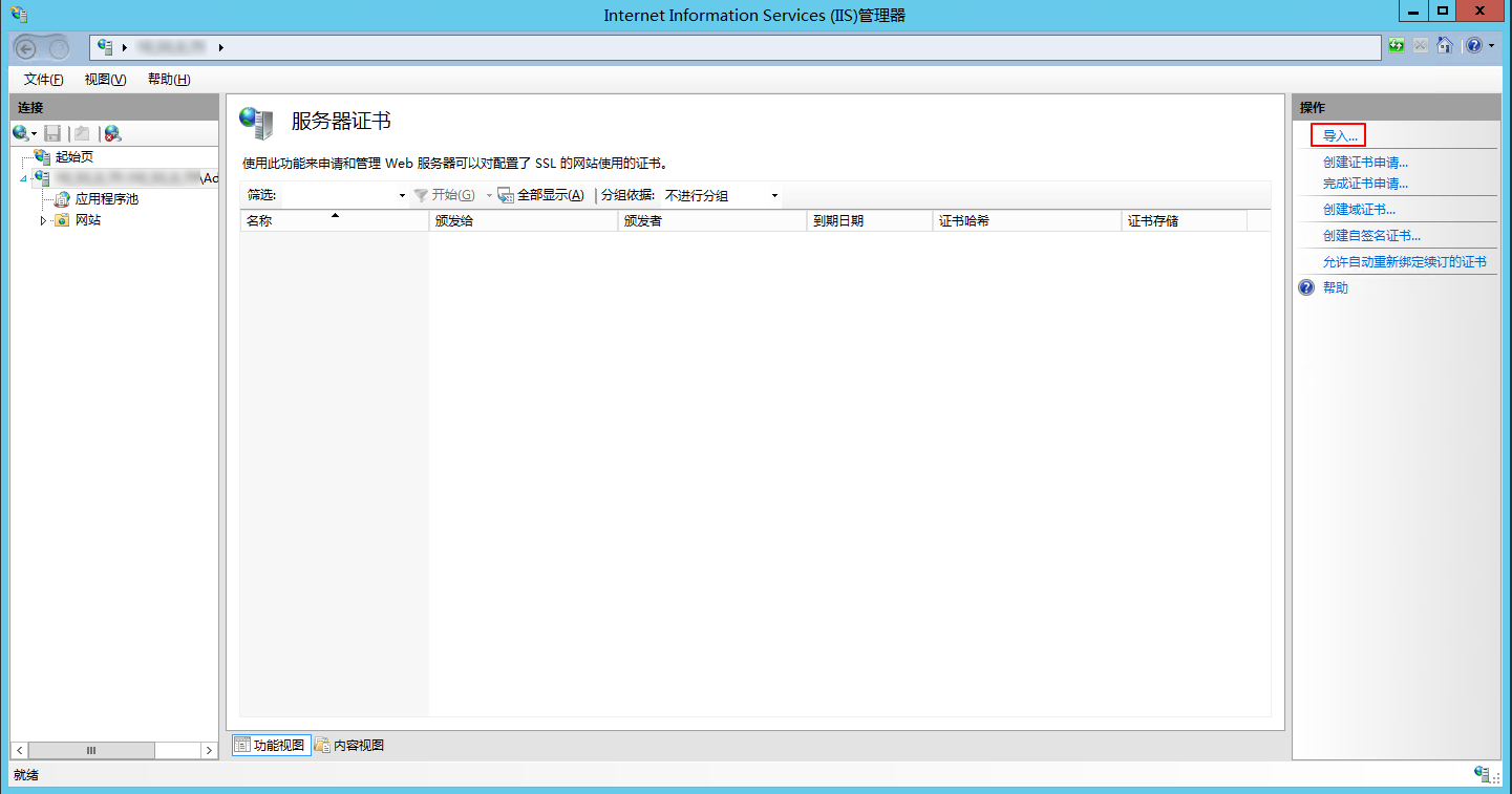 在服务器证书窗口的右侧 “操作” 栏中,单击导入。如下图所示: