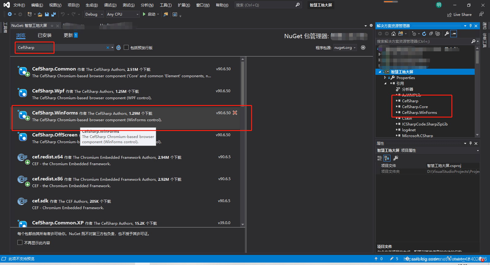 2.右击项目,选择“管理Nuget程序包”,点击“浏览”,搜索“CefSharp”,选择“CefSharp WinForms”下载安装。