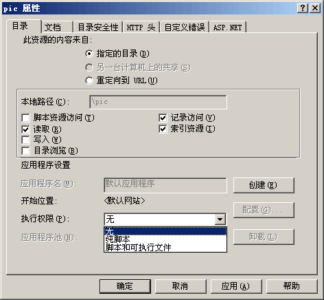 在IIS6.0中,对于站点每个文件夹,我们都可以在其属性对话框中将执行权限设置为无,当程序对文件夹有写入权限时,这个设置非常有用,它能防止用户上传脚本文件(.asp,.aspx)到服务器并运行: