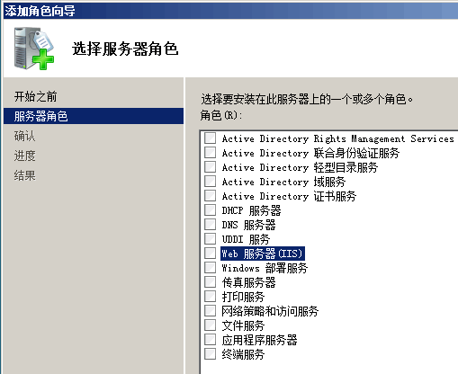 2.在"选择服务器角色"界面中钩选"Web 服务器",点下一步: