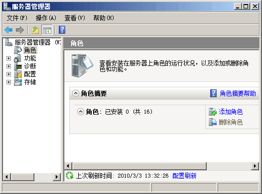 1.打开"控制面板→管理工具→服务器管理器",选择"角色",在右边点击"添加角色":