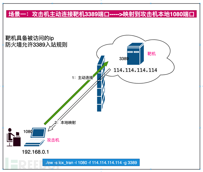 二、端口转发功能场景一在攻击机运行工具,主动连接靶机3389端口,并将靶机的3389映射到攻击机本地1080端口;达到在攻击机侧访问本地1080端口,将数据转发到靶机3389; ./ew -s lcx_tran -l 1080 -f 114.114.114.114 -g 3389