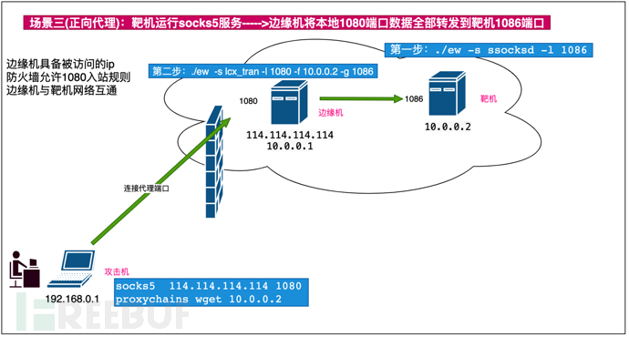 场景三(正向代理):靶机侧运行工具启动socks5服务,边缘机侧运行工具将本地从1080端口收到的数据全部转发到靶机1086端口,在攻击机侧使用代理工具(例如:proxychains)连接边缘机提供的1080端口;最终达到攻击机侧与靶机之间形成socks5代理通道,继续渗透扫描内网。 第一步在远端靶机10.0.0.2上创建监听端口1086: ./ew -s ssocksd -l 1086 第二步在远端边缘机上创建创建端口1080到靶机10.0.0.2端口1086的转发,防火墙和路由器需要开放远端边缘机端口1080的访问权限: ./ew -s lcx_tran -l 1080 -f 10.0.0.2 -g 1086