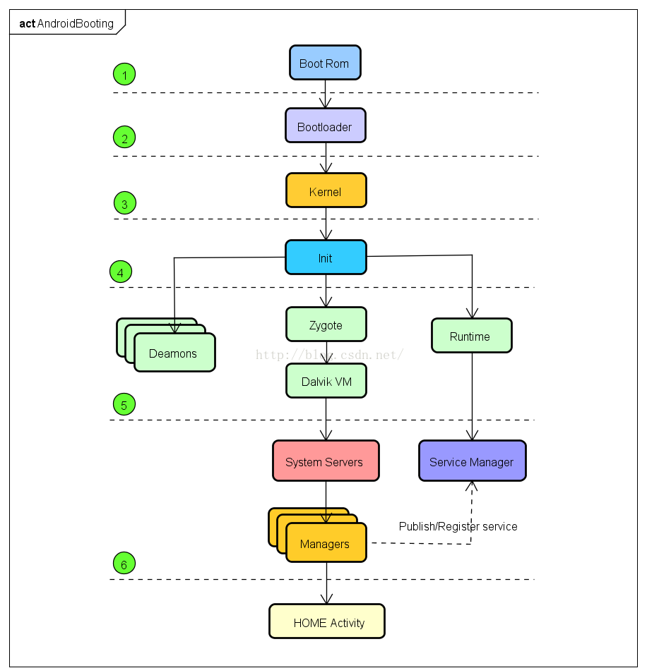 三、相关概念3.1 Android平台架构如下是Google官网提供的平台架构图,很直观地攘括了Android的层级,关于各个层级的结构,有想了解可以参考:https://developer.android.google.cn/guide/platform?hl=zh-cn ![]() ps: Android系统为什么要有Hal层? 3.2 Android启动架构如下是从某大佬的文章里摘取的图片,很详细地描述了Android系统启动过程:Boot Loader引导开机 -> Kernel -> Native -> Framework -> App ![]() 3.3 zImagezImage是一般情况下默认的压缩内核映像文件,压缩vmlinux,加上一段解压启动代码得到,只能从0X0地址运行。 3.4 RAMDISK RAMDISK(initrd) 是一个小的分区像,在引导时内核以只读方式挂载它。它只保护/int和一些置文件,它用于初始化和挂载其它的文件系统镜像。 3.5 RC文件rc文件,是用Android Init Language编写的特殊文件。用这种语法编写的文件,统一用".rc"后缀。所有rc文件,不会被编译/链接。它是配置文件,不是程序,是一种用于android init的配置文件。真正加载rc文件,并进行解析,做事情的是 Init进程。 四、详细设计![]() 4.1 Boot Rom当长按电源开机的时候,引导芯片开始从固化在ROM的预设代码开始执行,然后将加载引导程序到RAM中。 4.2 BootLoaderBootLoader又称为引导程序,它在运行操作系统之前运行的一段程序,是运行的第一个程序。主要的功能有检查RAM、初始化一些硬件外设等功能,它最终的目的是启动操作系统。 4.3 KernelKernel初始化可以分成三部分:zImage解压缩、kernel的汇编启动阶段、Kernel的C启动阶段 4.3.1 zImage解压缩阶段