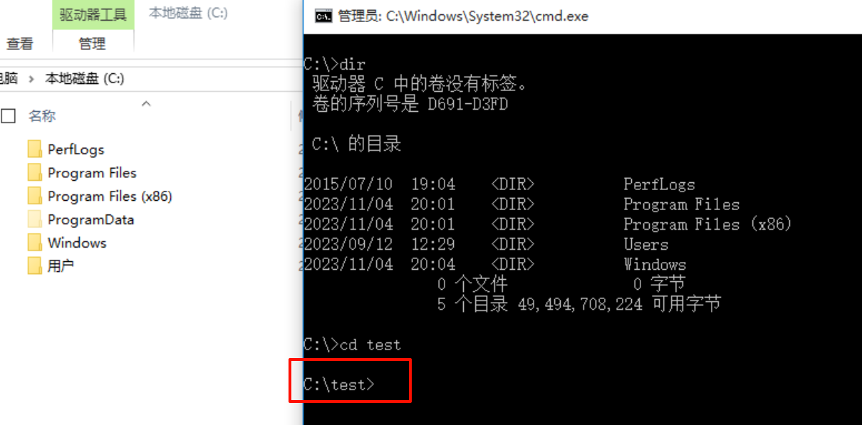 命令执行后,我们并看不到 test 目录,但是他是存在的,也是可以进入的