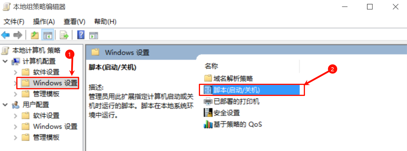 win+r打开输入gpedit.msc-->定位到"计算机配置一>Windows设置一>脚本(启动/关机)"