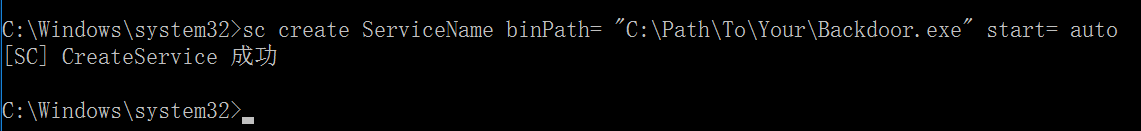 sc create ServiceName binPath= "C:\Path\To\Your\Backdoor.exe" start= auto