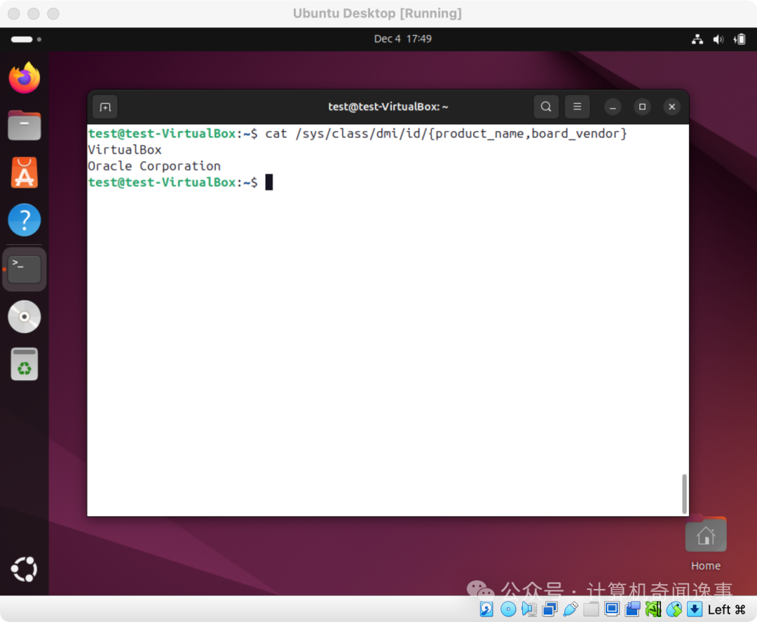 这里输出了“oracle”,证明 Ubuntu 是知道自己运行在 Oracle VirtualBox 中的。