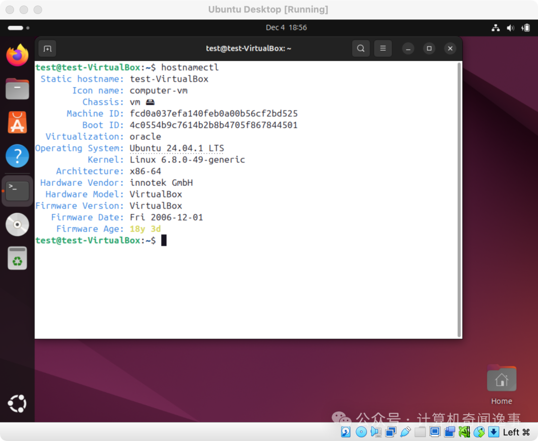 例如,这里在苹果的 macOS 上安装了 Oracle VirtualBox,又在新建的虚拟机中安装了 Ubuntu。那 Ubuntu 是否知道自己运行在虚拟机,而不是 mac 中呢?