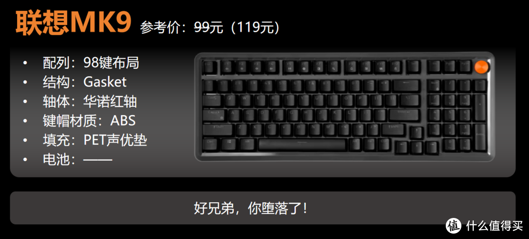 100元以内是机械键盘这类产品的真空地带,为了成本妥协,砍掉了三模和PBT键帽。普遍是有线的薄膜键盘或者ABS键帽,前者手感一般,后者不耐用。不过,ABS键帽属于是成本控制下的无奈之举。而这些产品后续都可以更换更耐用的PBT键帽。 联想 MK9