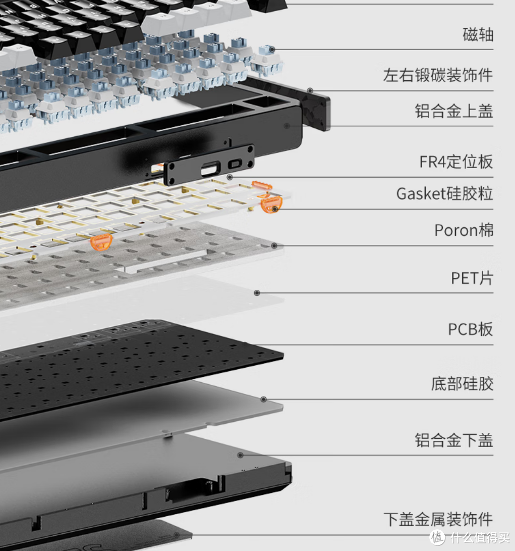 但是推荐B87的原因更多是因为胶坨坨。实际上,跟珂芝K98是一个路数,都是厚胶位注塑,更厚实,更耐摔,更结实。具有铝坨坨的厚重感,同时还能做麻将音,但是没铝坨坨那么贵。 B87只推荐6300mAh版本,高配版的KCA热升华和侧刻渐变俩键帽的版本太贵了。3150mAh电池太小了。划不来。所以,推荐还是推荐中配版本,偏实用主义。 声音填充给了五层,Poron夹心棉+IXPE轴下垫+PCB覆膜+Poron轴座棉+底垫。