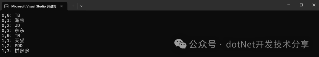 Array platformArrayx = Array.CreateInstance(typeof(String), 24);platformArrayx.SetValue("TB"00);platformArrayx.SetValue("淘宝"01);platformArrayx.SetValue("JD"02);platformArrayx.SetValue("京东"03);platformArrayx.SetValue("TM"10);platformArrayx.SetValue("天猫"11);platformArrayx.SetValue("PDD"12);platformArrayx.SetValue("拼多多"13);for (int i = 0; i < platformArrayx.GetLength(0); i++){    for (int j = 0; j < platformArrayx.GetLength(1); j++)    {        Console.WriteLine($"{i.ToString()},{j.ToString()}{platformArrayx.GetValue(i, j)}");    }}