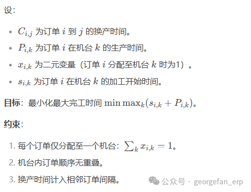 该问题属于复杂的调度优化问题,需在满足换产顺序约束的前提下,将订单分配到各机台并优化加工顺序,以最小化总生产时间(最大完工时间)。以下是分步解决方案: