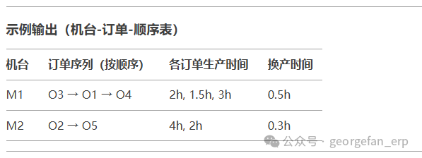 3. 对每个机台的订单进行排序,以最小化换产时间总和,可使用启发式算法。