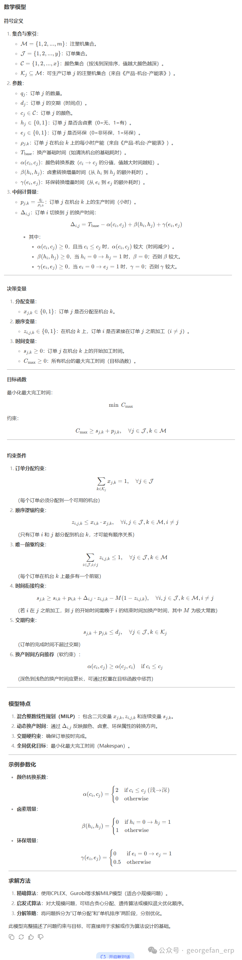 这次Deepseek给出的不仅是一个解决问题的框架性的方案,还给出了详细的求解模型的数学描述(数学建模),你只要找一个商业求解器,就能立马进行测试了!!!APS从阳春白雪进入了平民化,往昔,只有应用数学的硕士博士们擅长的数学建模工作,就这么被AI掀桌子了!激动过后,是内心的凄凉!继八字算命之后,又一个行业被毁了。