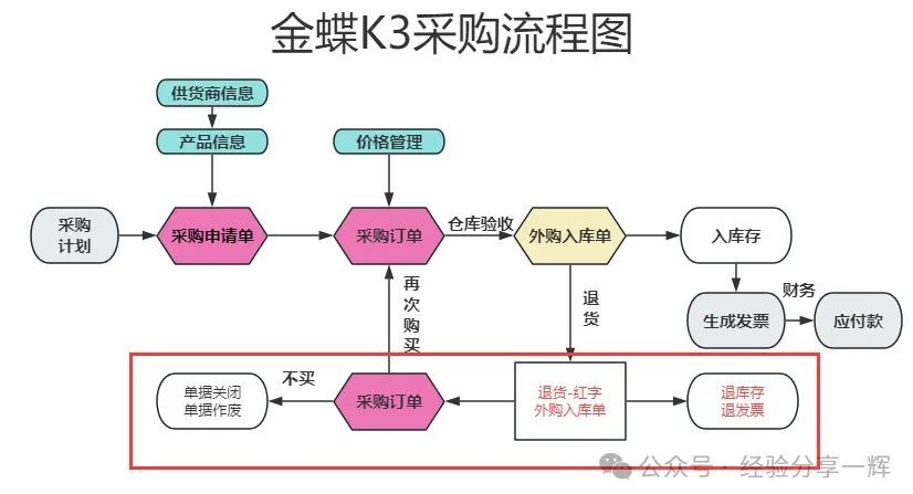 我们再讲一次金蝶的采购流程:录(采购申请单)时,我们要填写(产品信息)。流程到采购订单时,我们要填写(价格)和(供货商信息)。到货后,仓库验货,填写(入库单),没有问题就产品入库存,生成记账发票,结束采购流程。