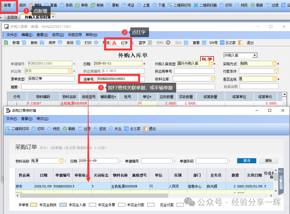 此方法比直接(下推-生成外购入库)的方法多了两步,1是选(红字),2是手动关联单据或手输单据。