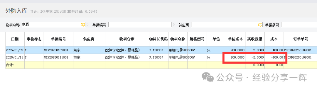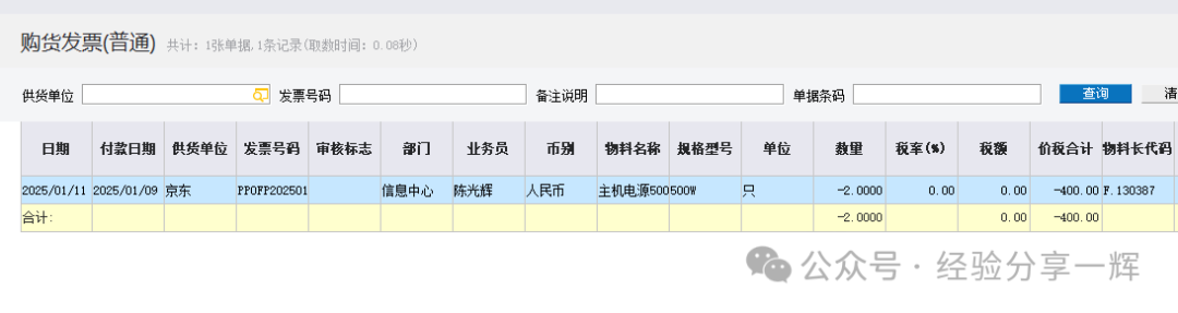 还是我们之前的例子:京东,采购两个500W电脑电源,200元/个,现在要做退货处理。