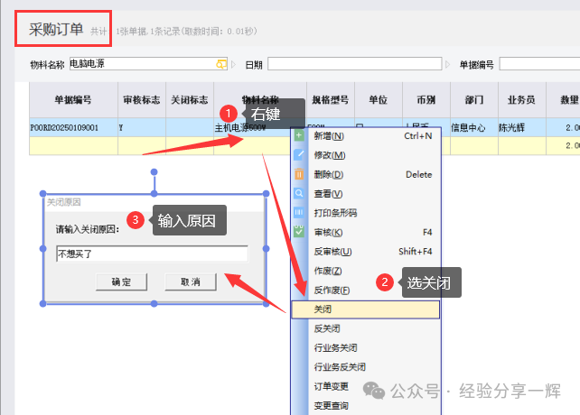 在(采购订单维护)里面,找到我们的单据,右键选择(关闭),输入关闭原因。