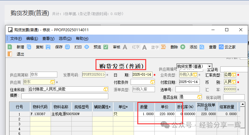 因这次只买一个,价格为220元,外购入库单关联采购订单后,要改入库数量和采购单价,并保存审核