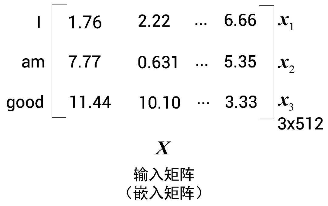 的维度为[句子的长度×词嵌入向量维度]。原句的长度为 3,假设词嵌入向量维度为 512,那么输入矩阵的维度就是 [3×512]。