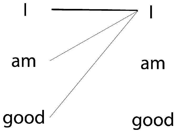 要计算一个词的特征值,自注意力机制会使该词与给定句子中的所有词联系起来。还是以 I am good 这句话为例。为了计算单词 I 的特征值,我们将单词 I 与句子中的所有单词一一关联,如图 1-8 所示。