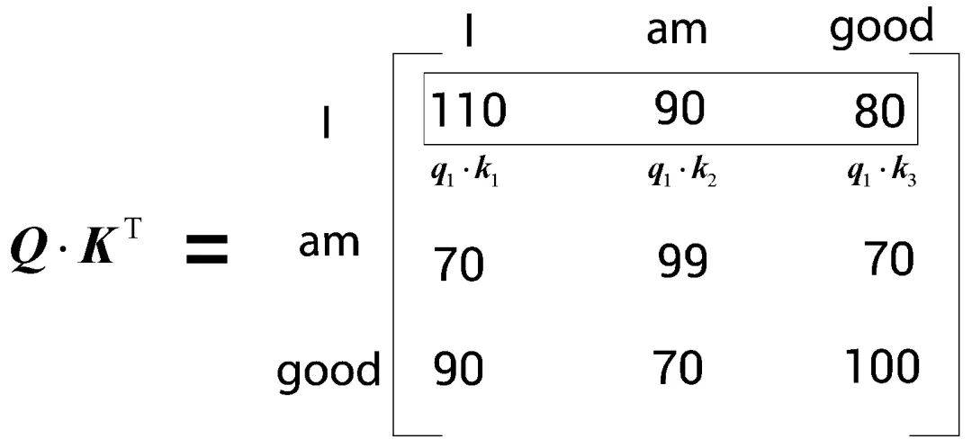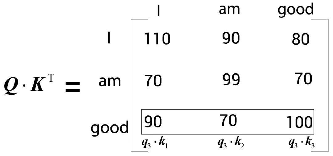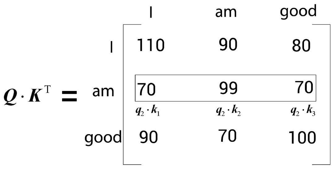 (good)的点积。因此,第 2 行表示目标词 Je 与原句中所有的词(I、am 和 good)的相似度。